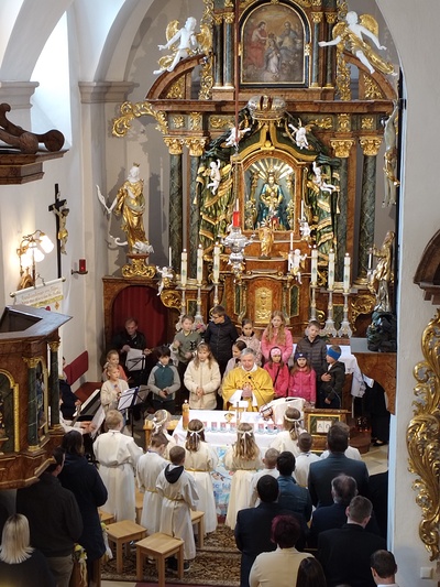 Mit der Musikkapelle Sallingberg zogen die Erstkommunionkinder und deren Familien zur Kirche, dort zelebrierte Pfarrer Peter Rückl die feierliche Eucharistie und ermutigte die Kinder, Jesus als treuen Begleiter durch ihr Leben zu sehen – ähnlich wie das Wasser für den Fisch unverzichtbar ist.